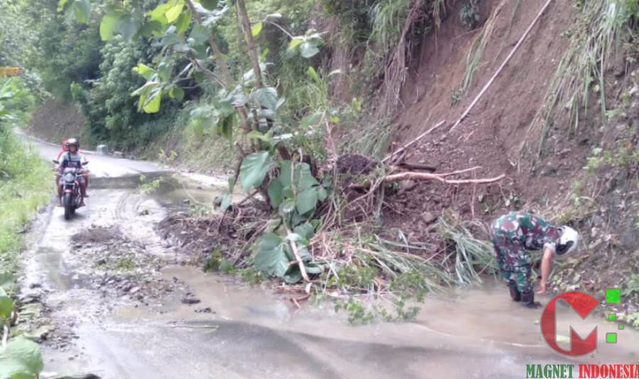 Dandi mengaku sejak pagi masyarakat setempat dan perangkat desa bergotong royong membersihkan material batu dan tanah yang sempat menutup badan jalan kabupaten itu dengan alat seadanya.